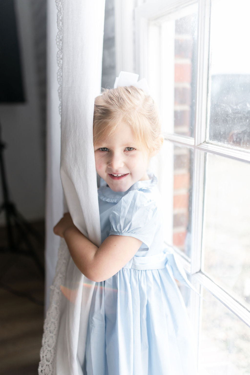 light blue dress with a large white bow