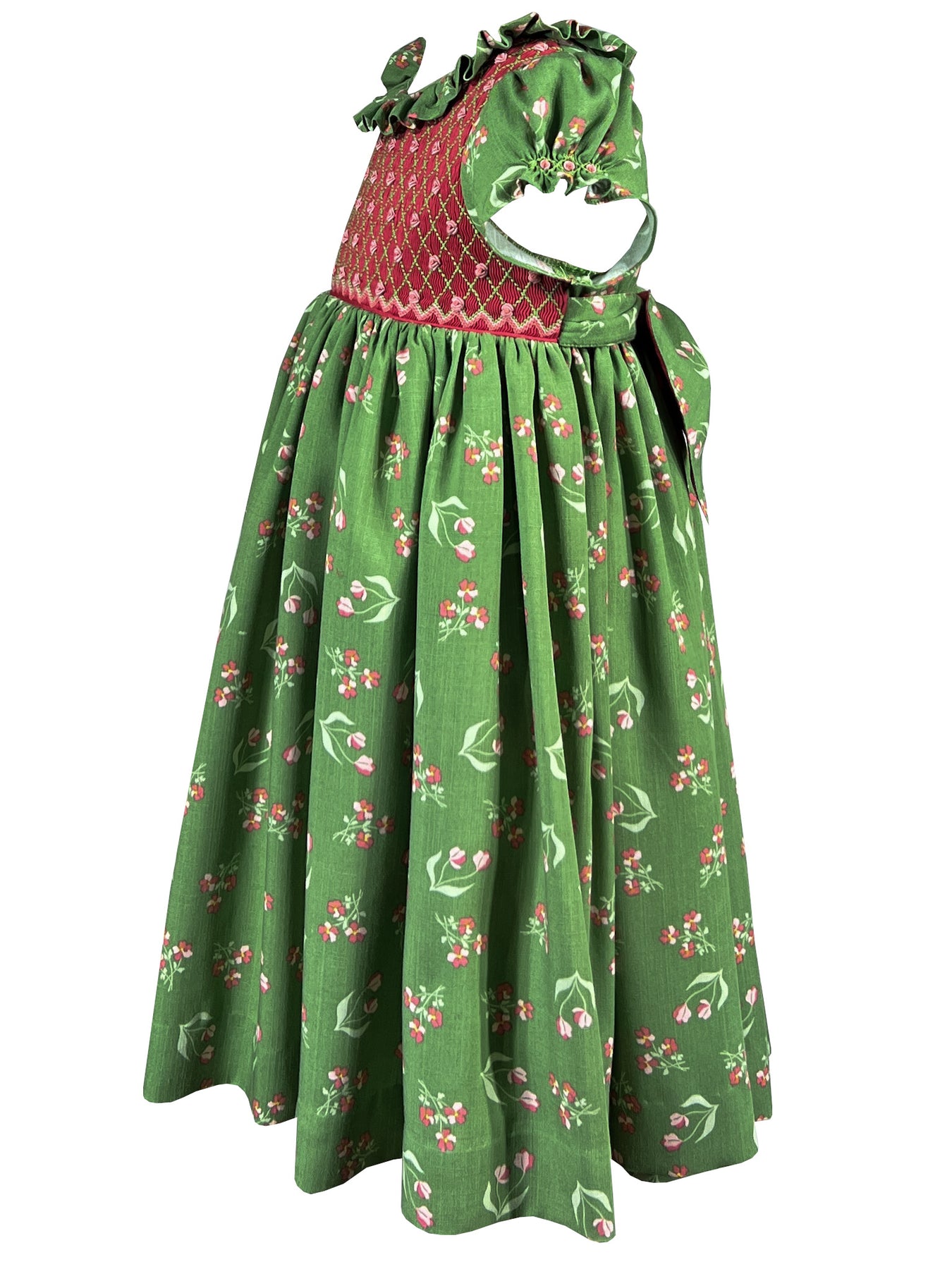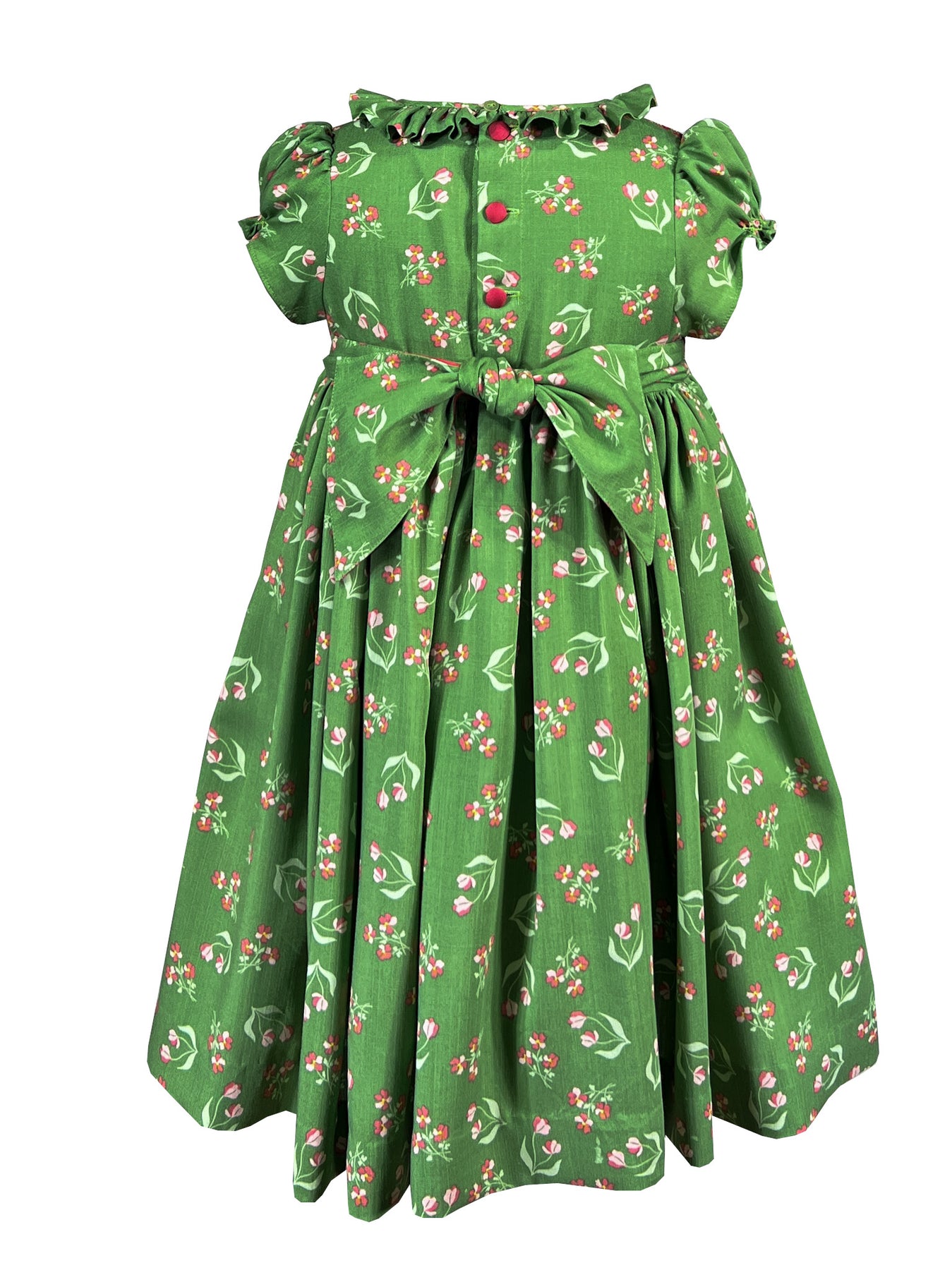 A wide frilled collar creates a soft frame, while puffed sleeves gathered at embroidered cuffs add gentle structure. The sophisticated pairing of fresh spring green with coral red offers unexpected elegance, while the interplay between the geometric precision of the smocking and the organic flow of the print creates harmonious balance. A butterfly bow sash at the back and self covered buttons complete this thoughtful design. This is a dress which invites us to slow down and notice beauty in every detail.