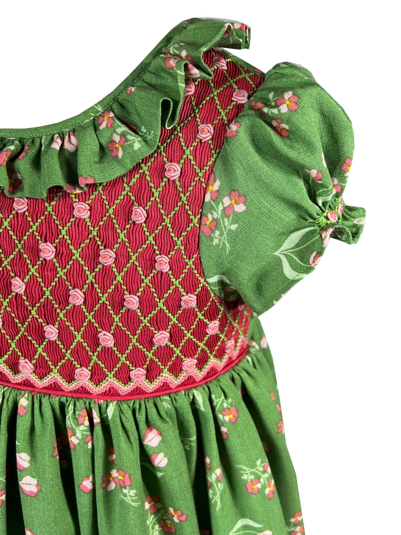The Floral Wanderings dress captures the serenity of a springtime garden stroll. The fully smocked bodice in coral red extends gracefully from neckline to shoulder, featuring an elegant diamond lattice pattern where delicate rosebuds bloom at each intersection. Below, a vibrant spring green canvas hosts scattered coral and red florals with graceful stems and leaves, evoking the quiet discoveries found along a garden path.