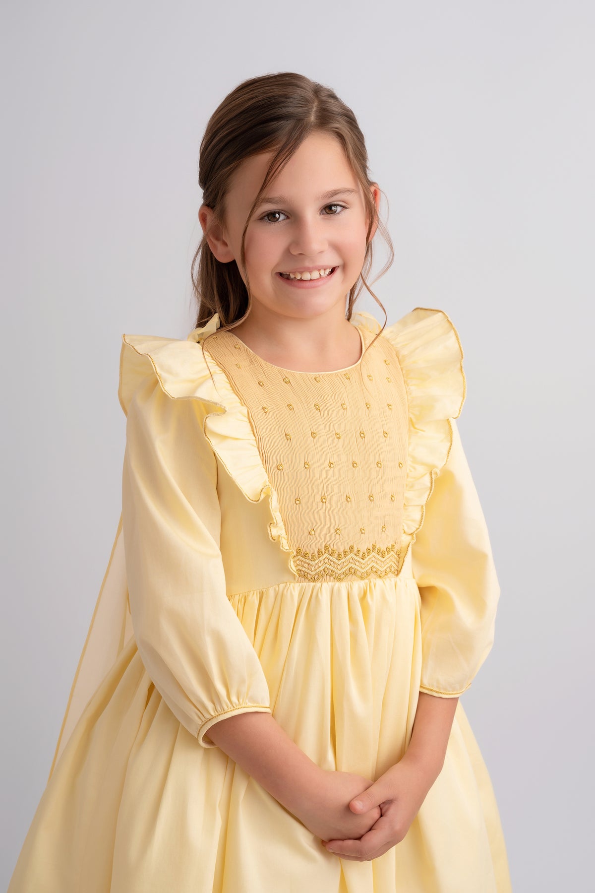 The exquisite hand-smocked bodice showcases the finest traditional needlework, where golden threads create intricate jewel like patterns that seem to shimmer with their own magic. The smocking creates beautiful texture and dimension.