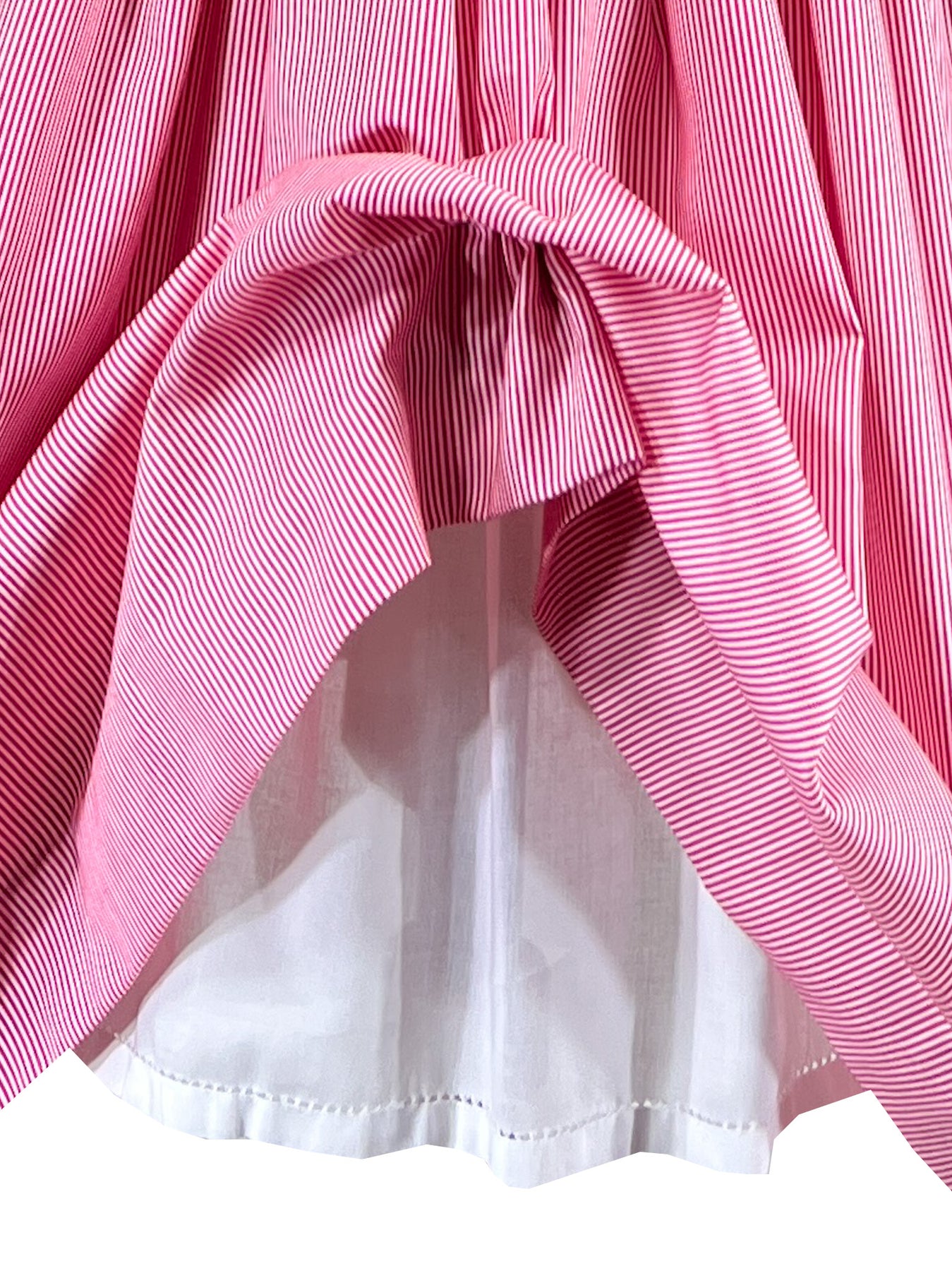 The Red Meridian dress draws its name from those defining lines that connect distant places, much like the stripes that traverse this dress. The handsmocked waistband is where the metamorphosis truly happens: traditional red transforms through subtle gradations of grey and white, proving that even the most classic stripe can be reimagined with artistry. This is heritage craftsmanship meeting modern sensibility, a piece for the collector who appreciates nuance within simplicity.
