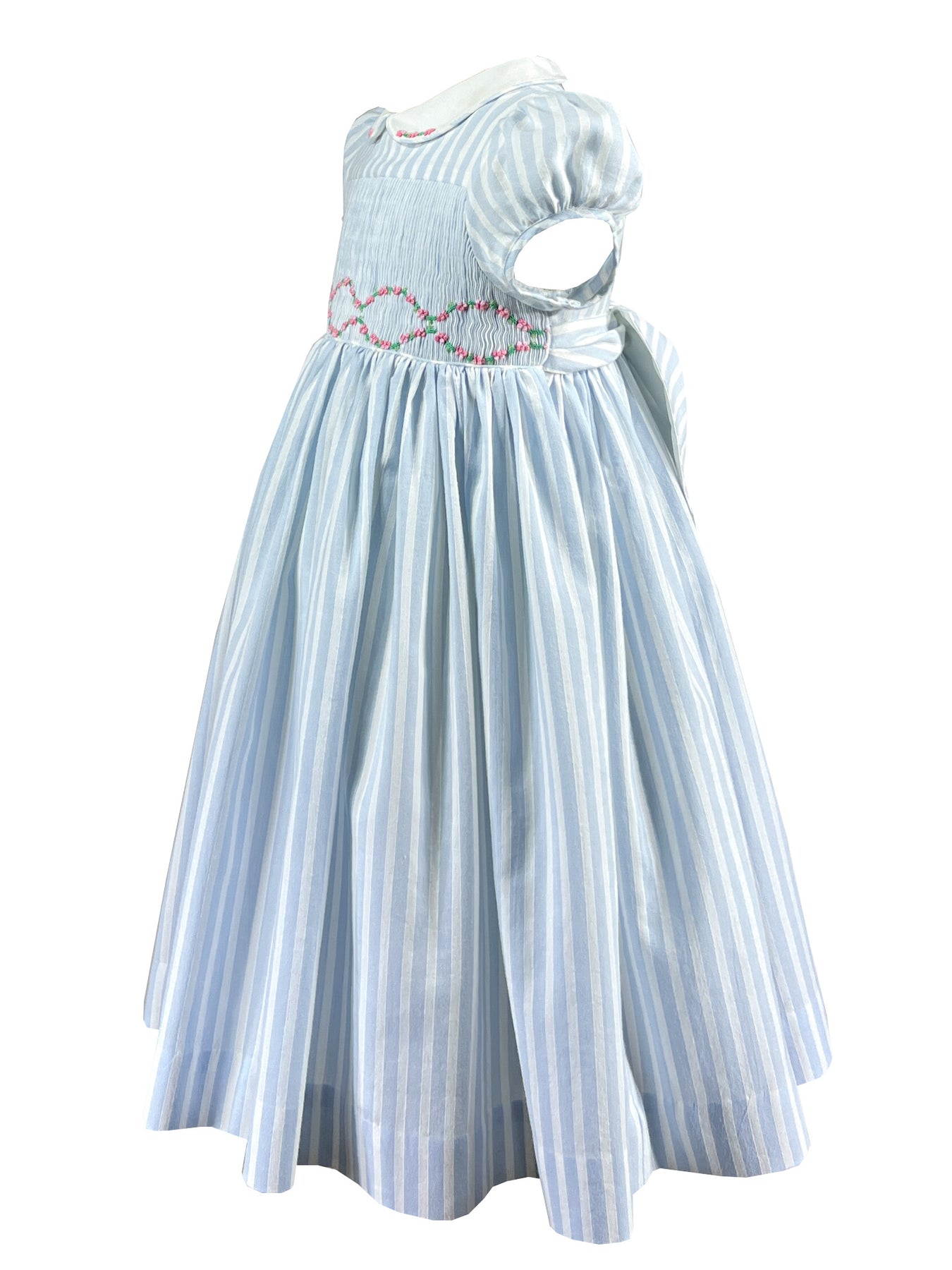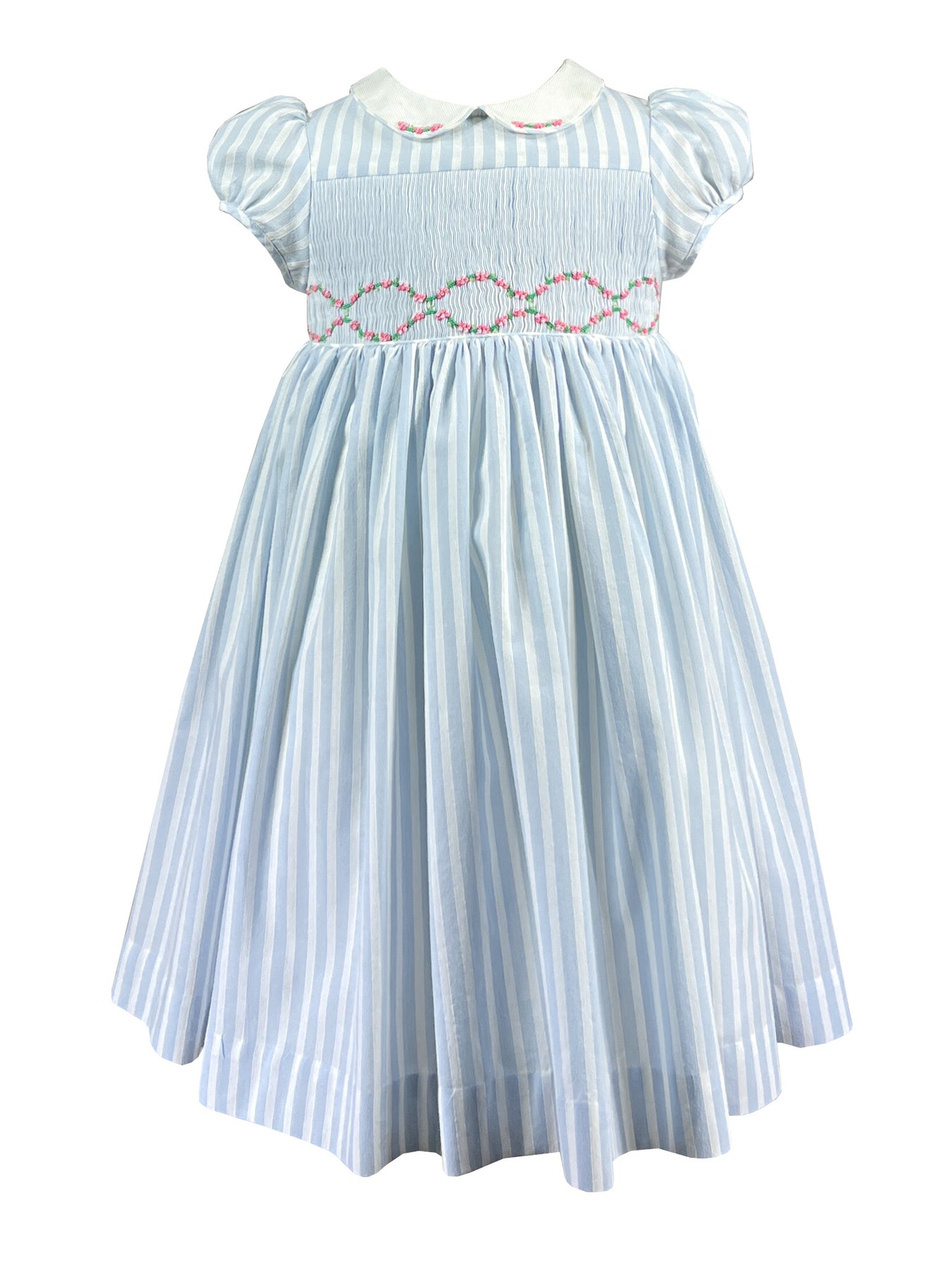 Light blue striped dress with green floral garland, smocked waist girls dress, classic children's wear, Peter Pan collar