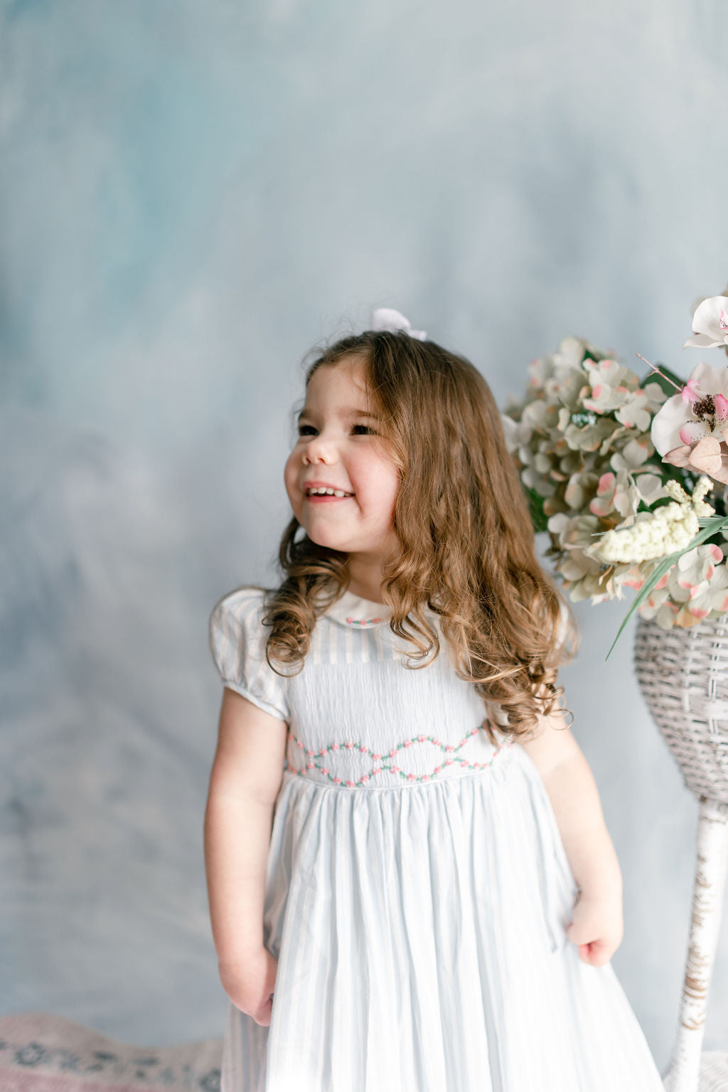 The handsmocked bodice is adorned with a floral garland at the waist in pink and green, bringing botanical beauty to traditional simplicity. Puffed sleeves add volume and softness, while the butterfly bow sash at the back creates a flattering silhouette. Self covered white buttons provide the finishing touch. This dress effortlessly bridges seaside elegance and garden romance.