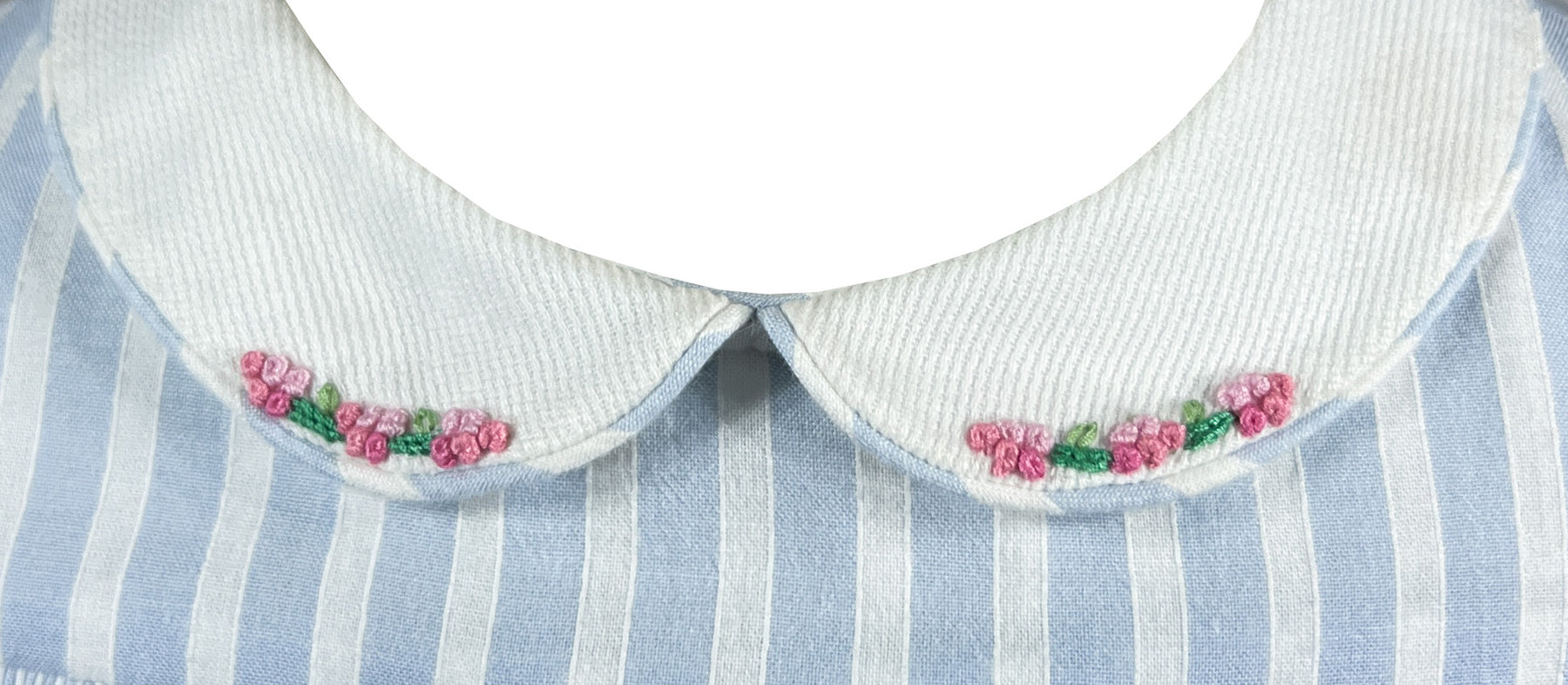 The Riviera Stripes dress is a timeless French style classic pairing light blue and white stripes with a charming floral garland. A white cotton piqué Peter Pan collar features delicate embroidery details and bias cut trim, setting the tone for this refined piece.