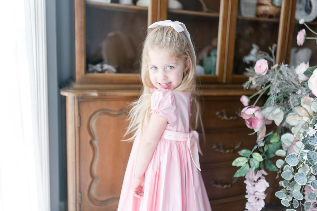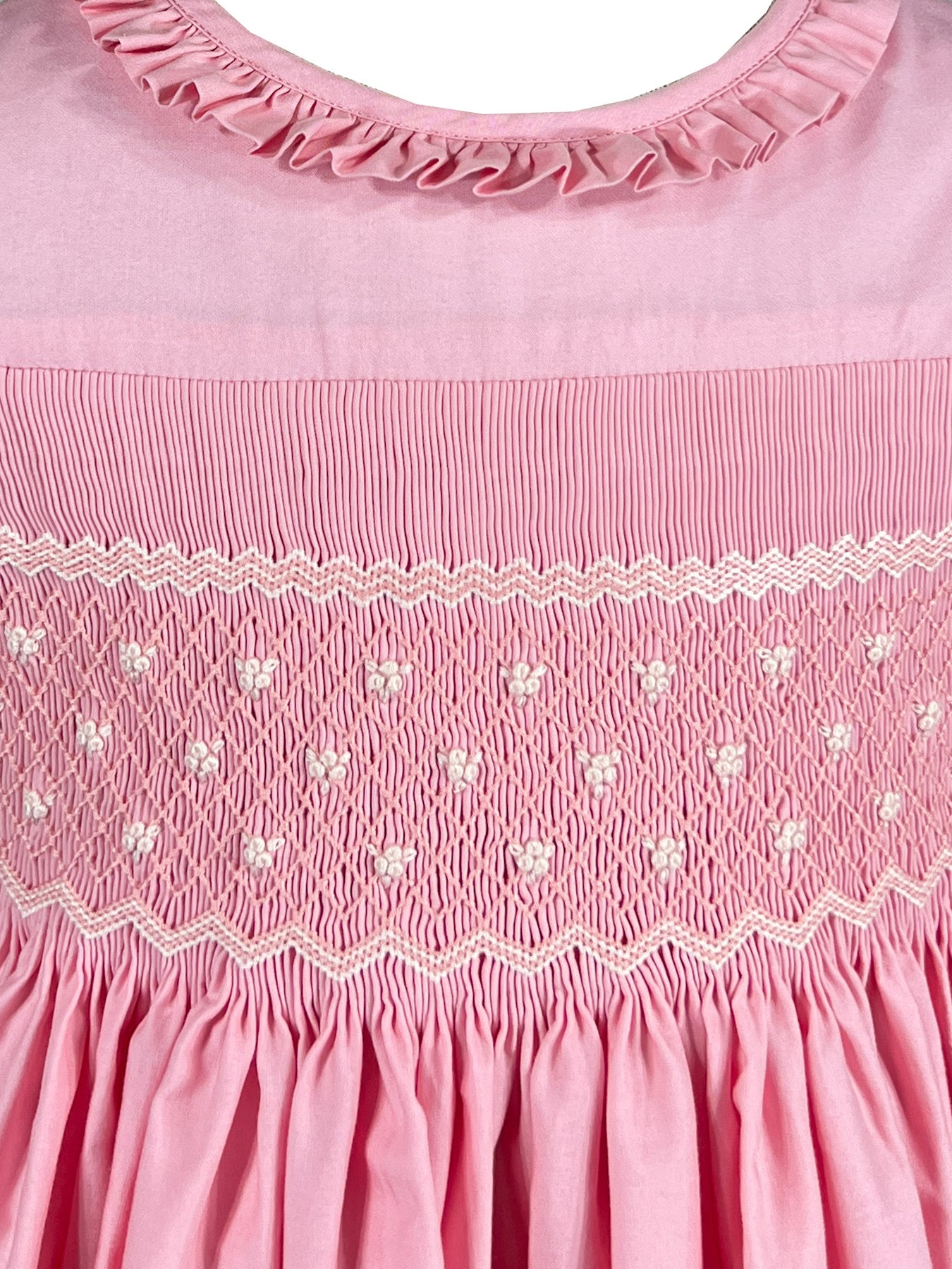 The signature puffed sleeves are gathered at the cuffs with delicate rosebud embroideries, a charming detail that speaks to careful craftsmanship. A frilled pleated collar frames the neckline with romantic flair, while the pink and cream smocked bodice creates subtle texture. A butterfly bow sash at the back and self covered buttons complete this enchanting piece.