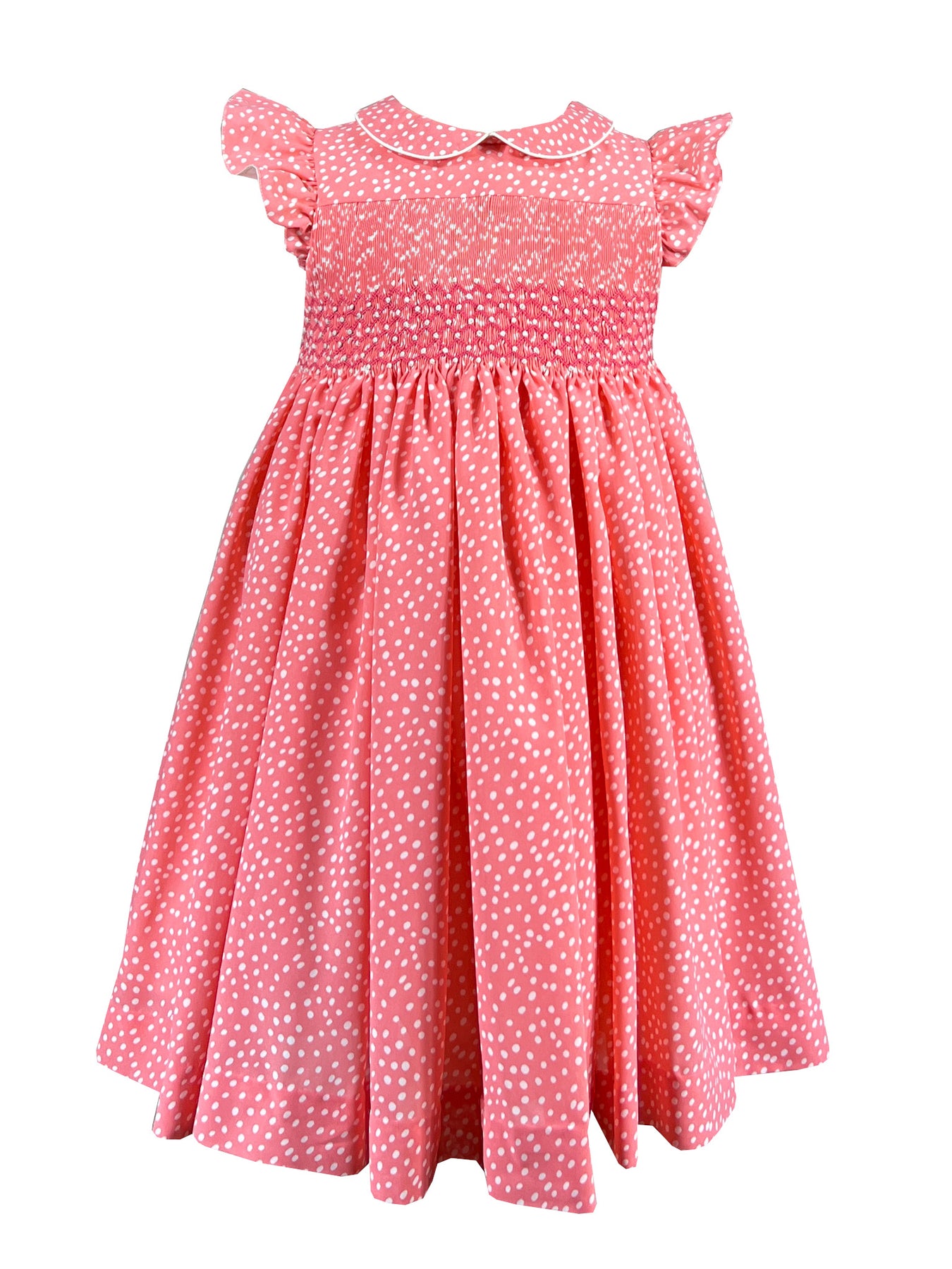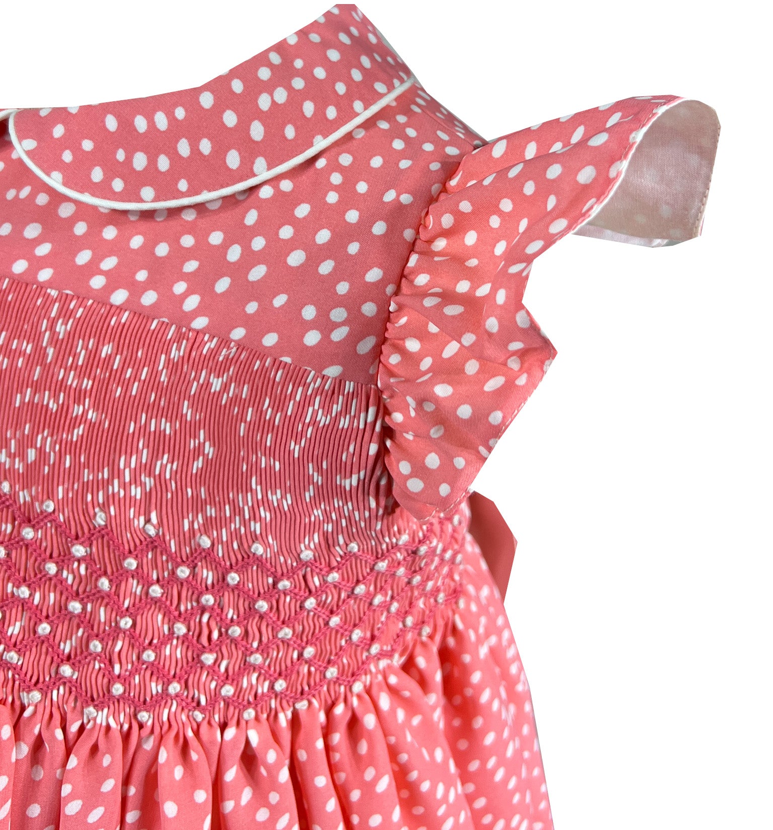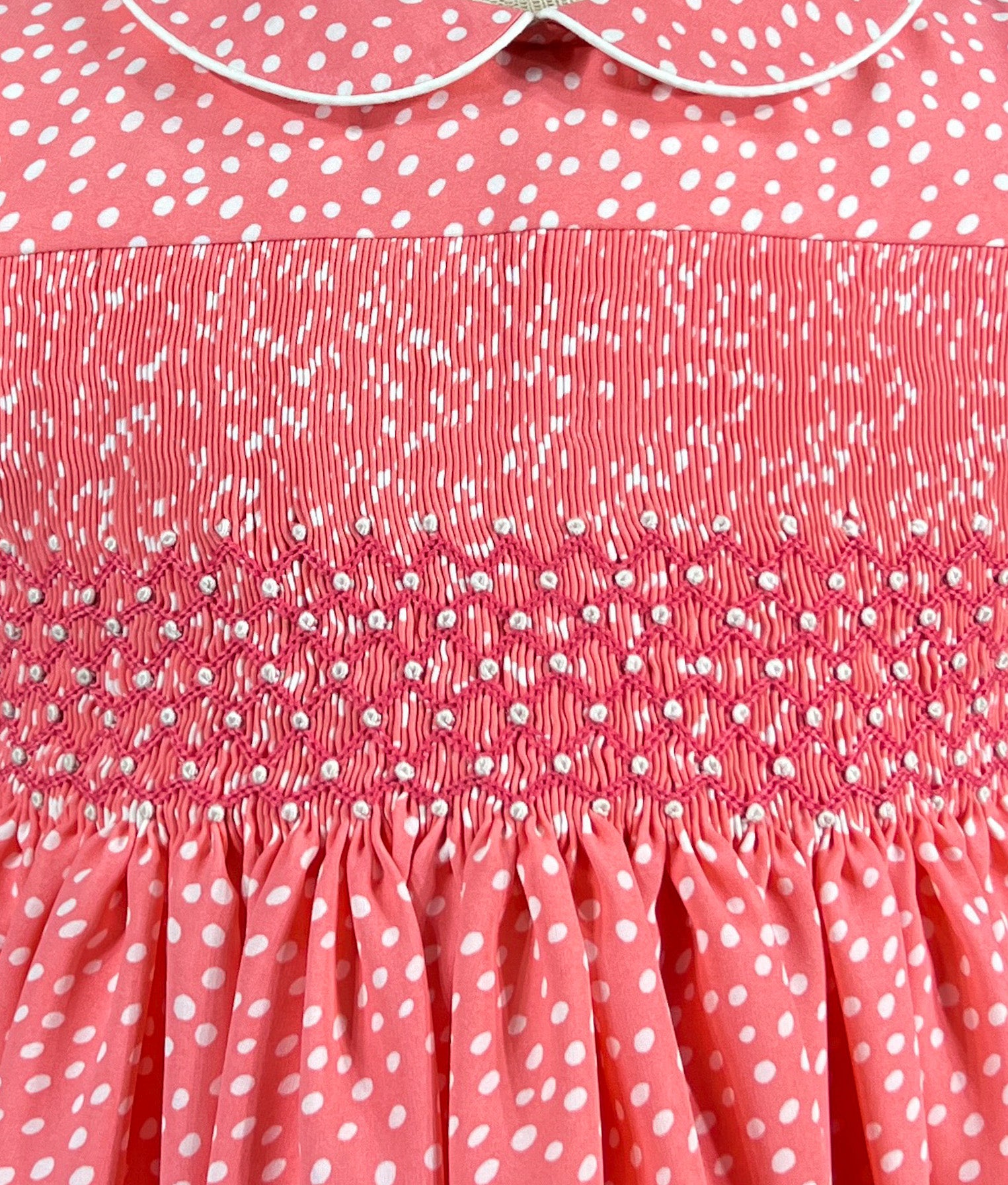 Joyful and spirited, the Spot On dress is rendered in soft, flowy fabric. Its coral background is scattered with white polka dots. The smocked bodice features a geometric pattern punctuated by white dots at each intersection, creating a playful interplay between structure and whimsy.