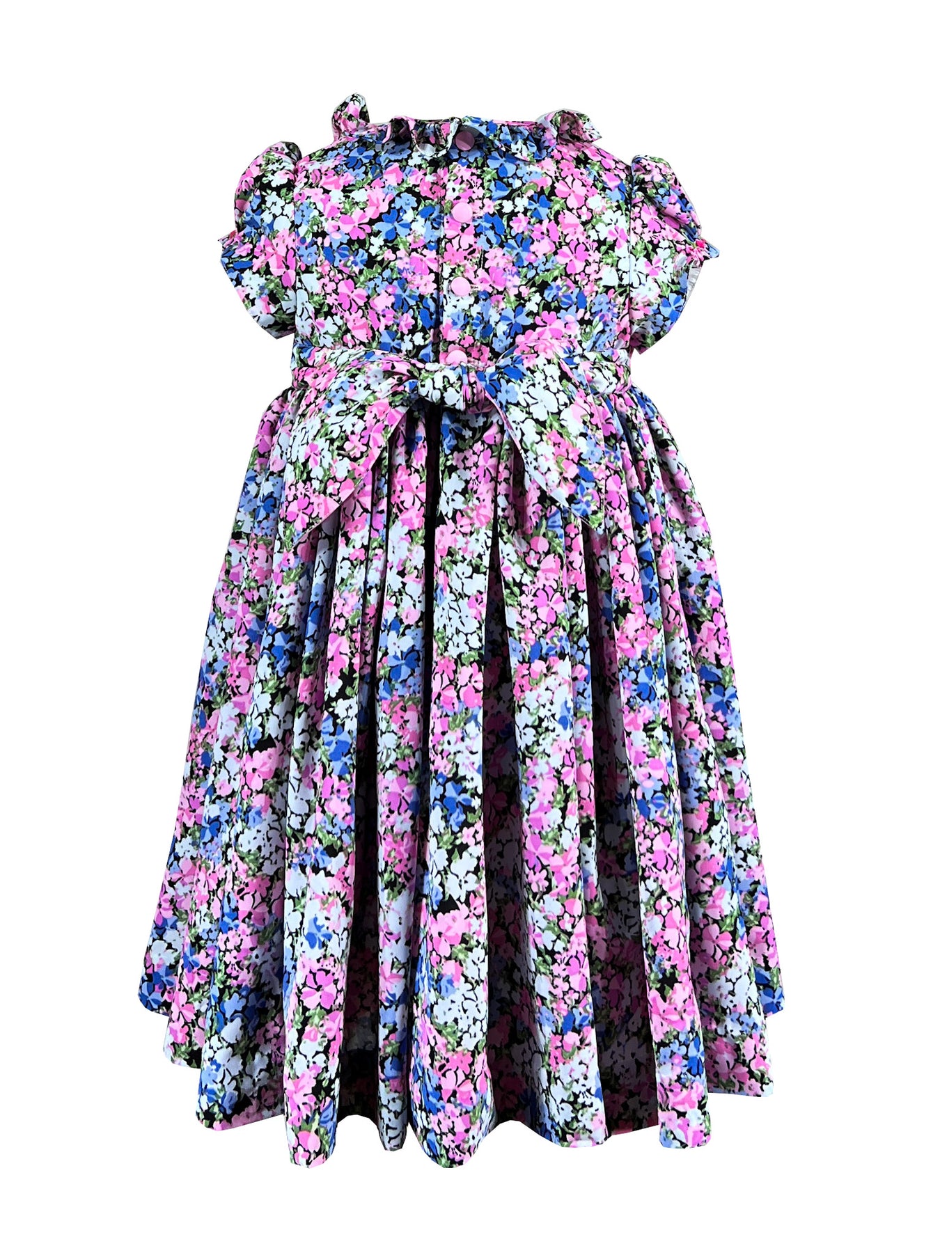 This dress celebrates nature's infinite variety. The fully smocked bodice in bright pink extends from neckline to shoulder, featuring an intricate diamond pattern adorned with delicate rick rack lines and miniature florals. The rest of the silhouette features a profusion of tiny multi-colored blooms scattered across black fabric creating a garden of endless discovery, where pink, blue, white, and green flowers dance together in cheerful harmony.