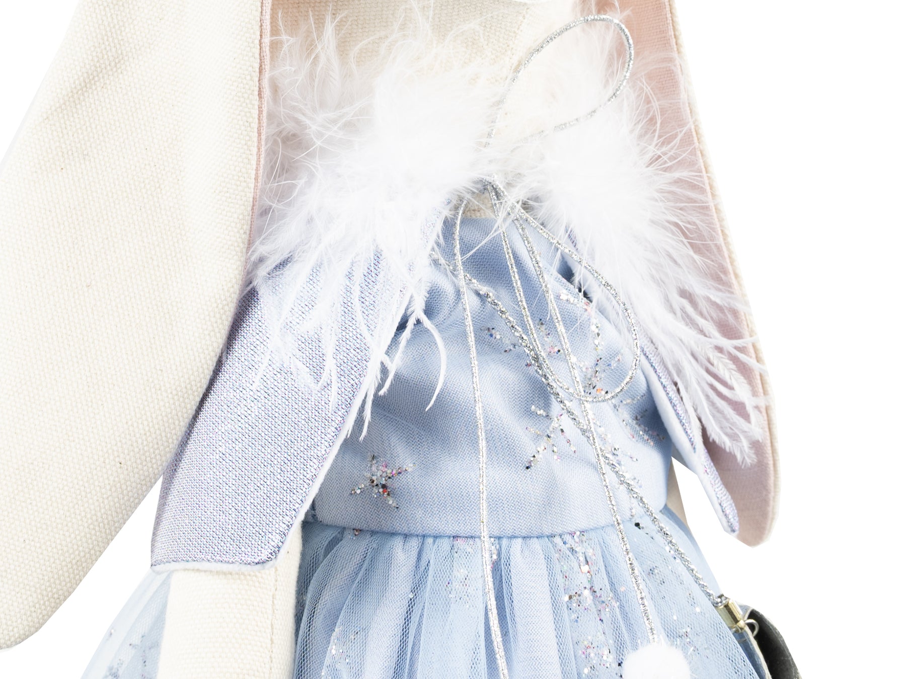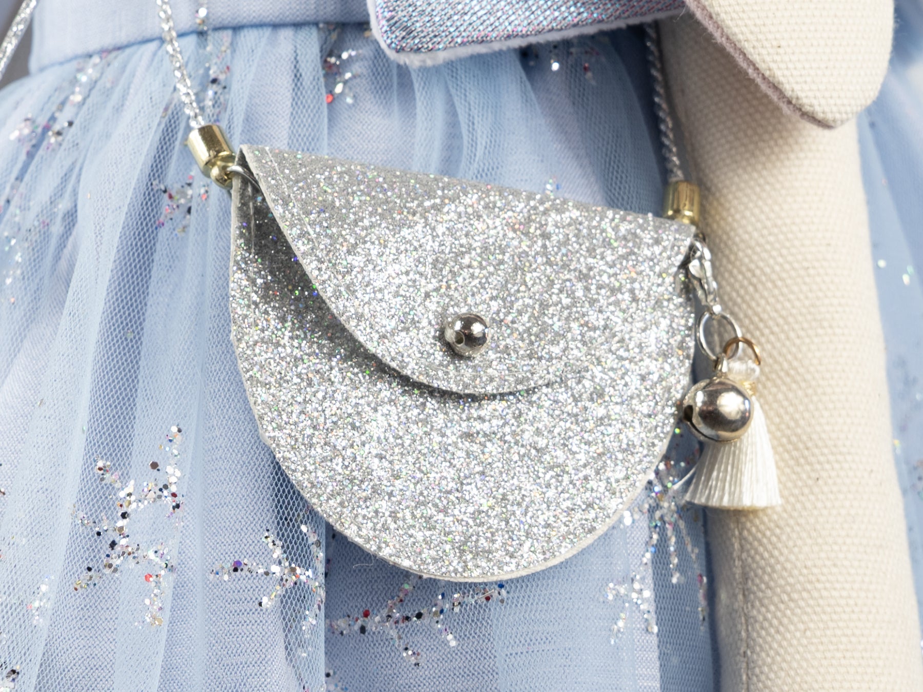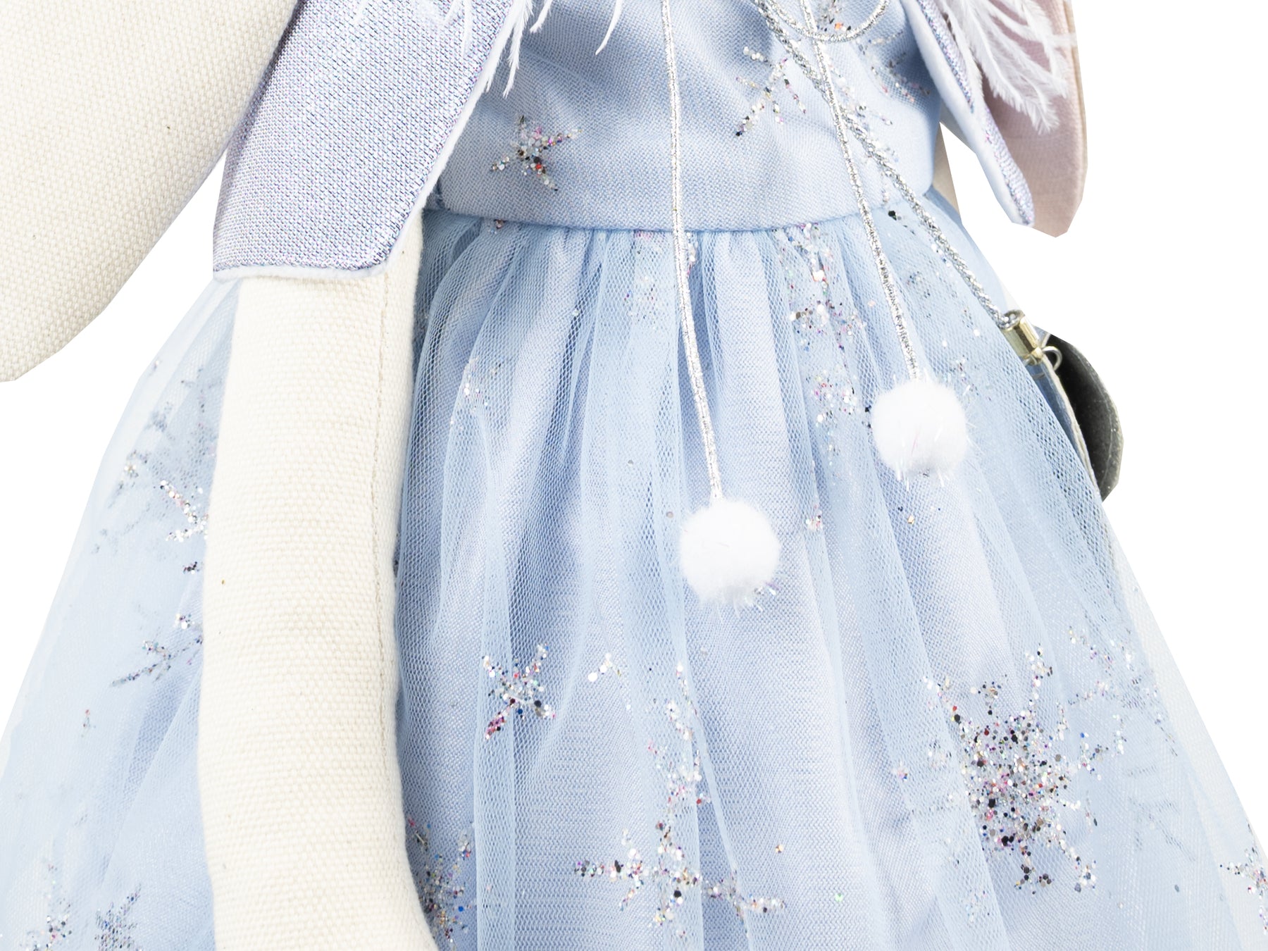 Couronnée d'une élégante couronne argentée orné de simili cristaux, elle porte une robe bleu glacier éthérée décorée de délicates broderies argentées en forme de flocons de neige et de paillettes scintillantes. Sa tenue est complétée par une veste à plumes blanches autour du cou, drapée sur ses épaules, un sac à main argenté scintillant avec des pompons blancs et des ballerines argentées à paillettes. Elle incarne la magie des paysages hivernaux et des contes de fées glacés.