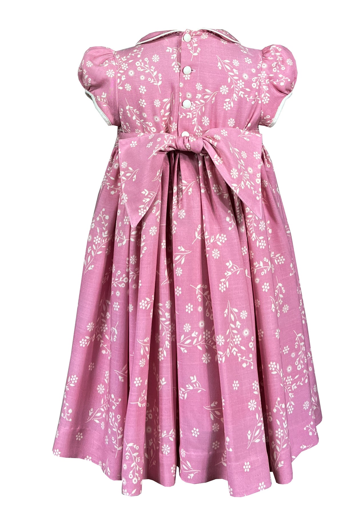 Le buste présente des smocks réalisé à la main dans des tons assortis, les motifs géométriques créant un magnifique décor sur la poitrine. Le col claudine et les manches ballons avec passepoil blanc apportent un charme classique. Les boutons décoratifs sur le devant créent un effet visuel attrayant, mais la robe se ferme dans le dos. La ceinture à nœud papillon assure un ajustement parfait à la taille.