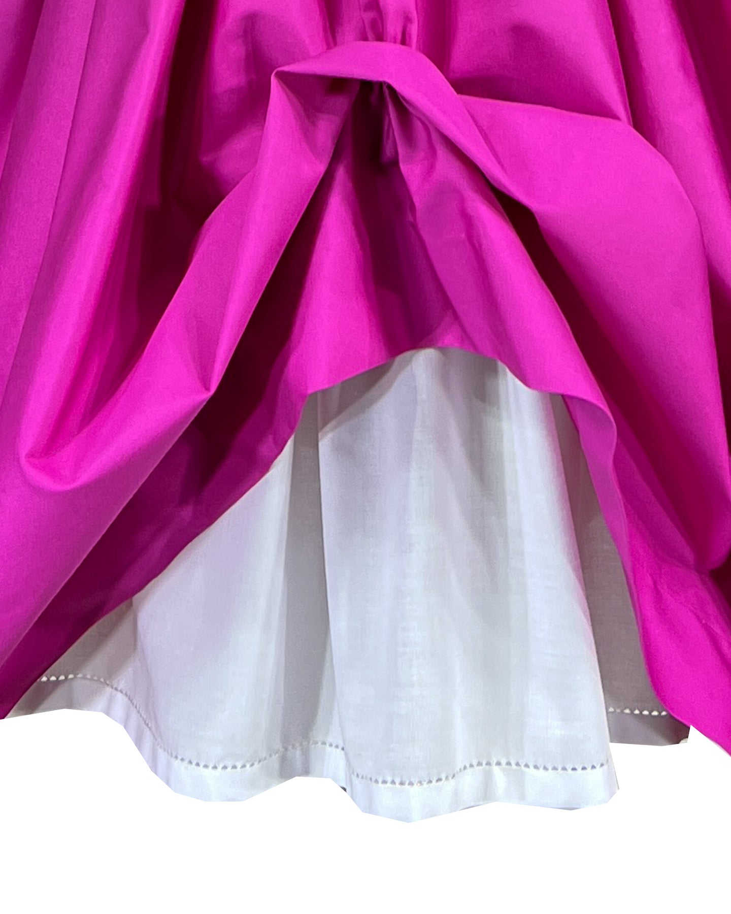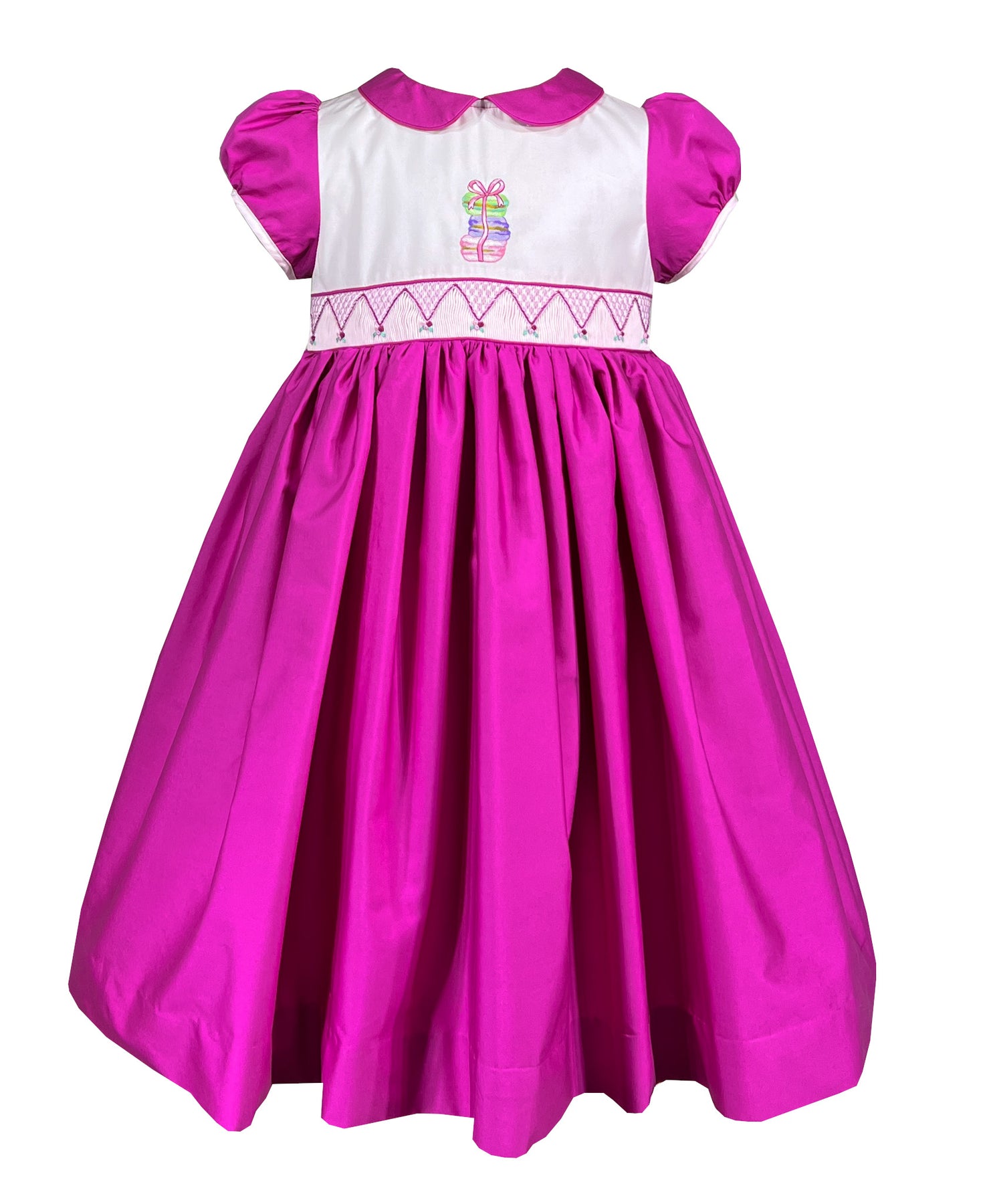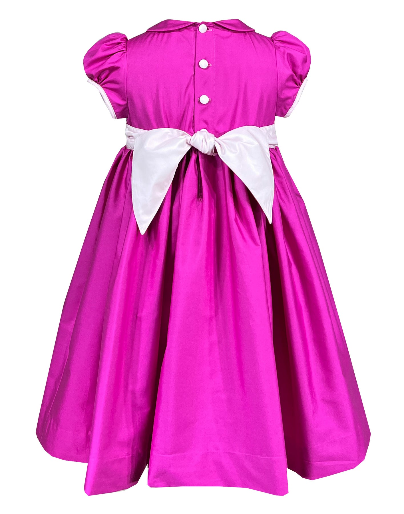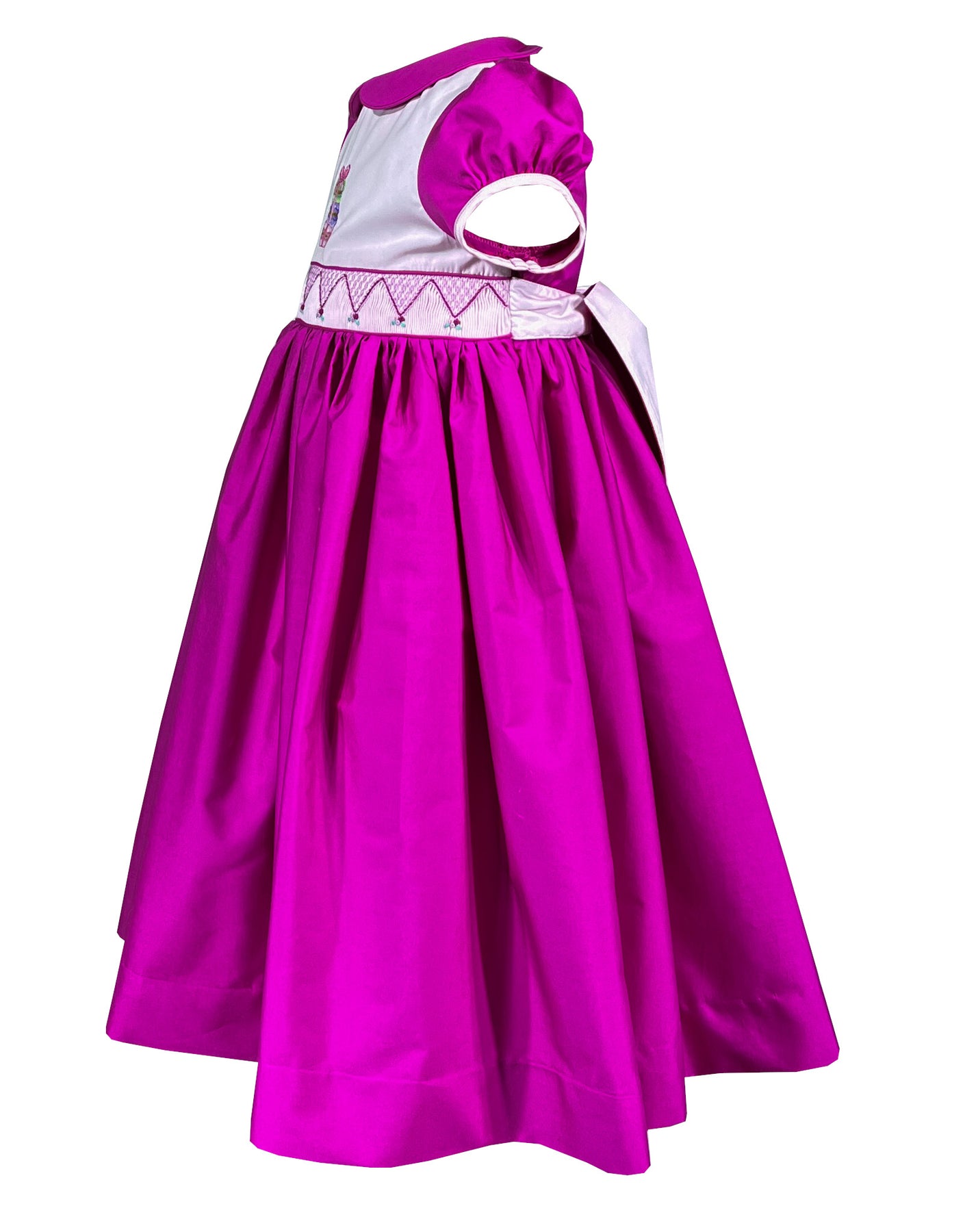Le buste blanc présente une bande smockée à la taille et une pile brodée de délicats macarons vert menthe, lilas et rose pâle, noués par un joli ruban. La jupe ample froncée tombe ensuite gracieusement dans un luxueux coton popeline fuchsia rose vif.