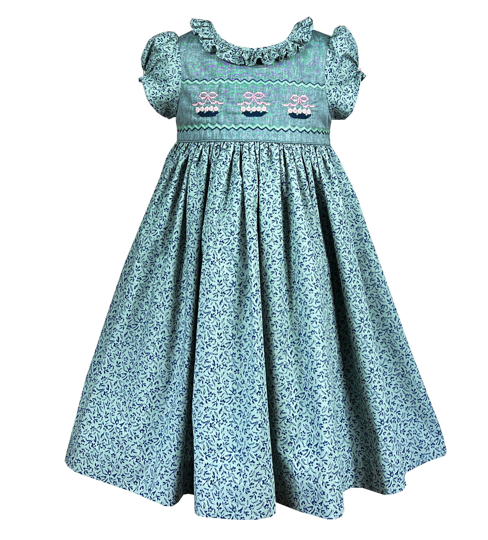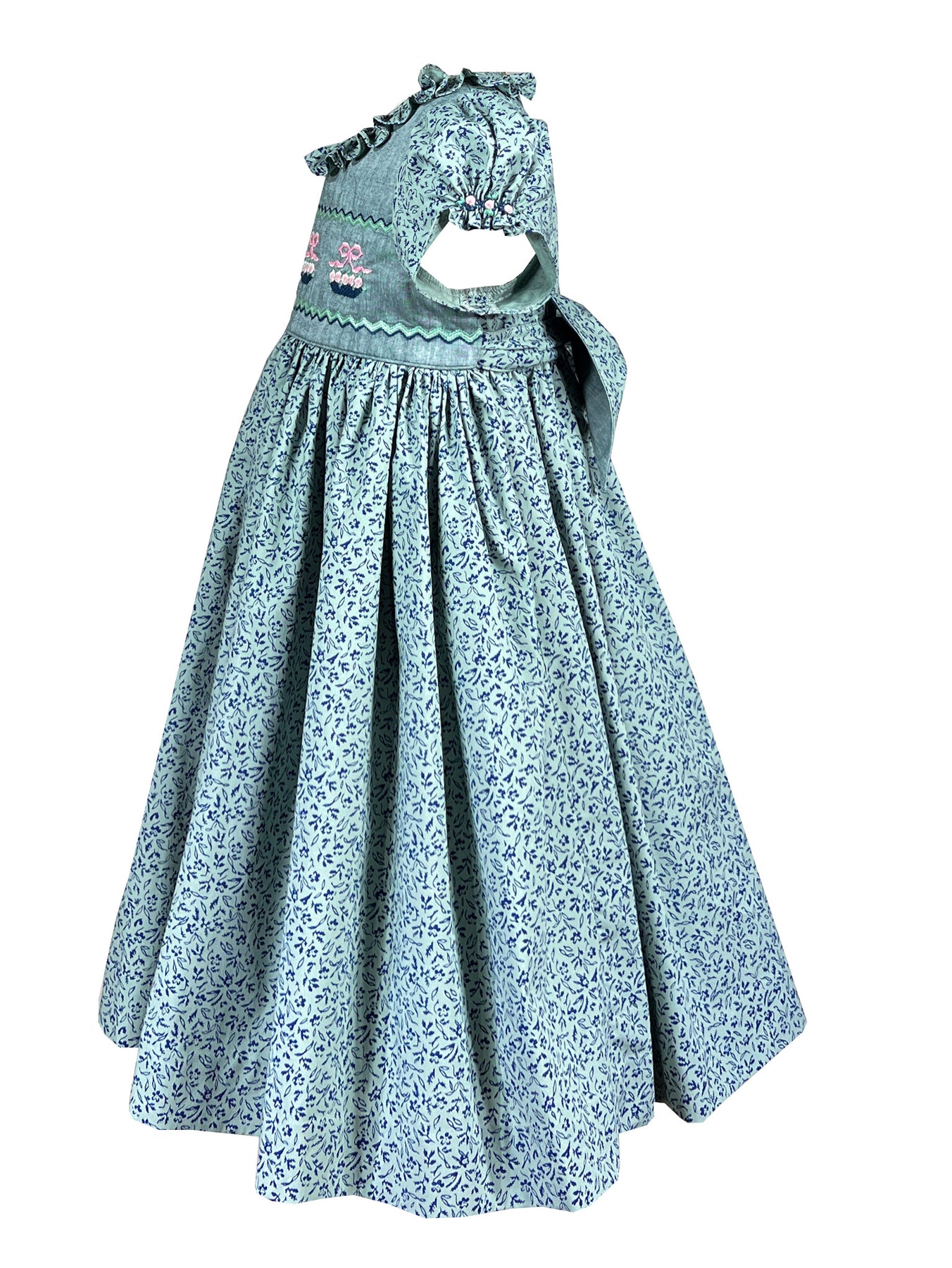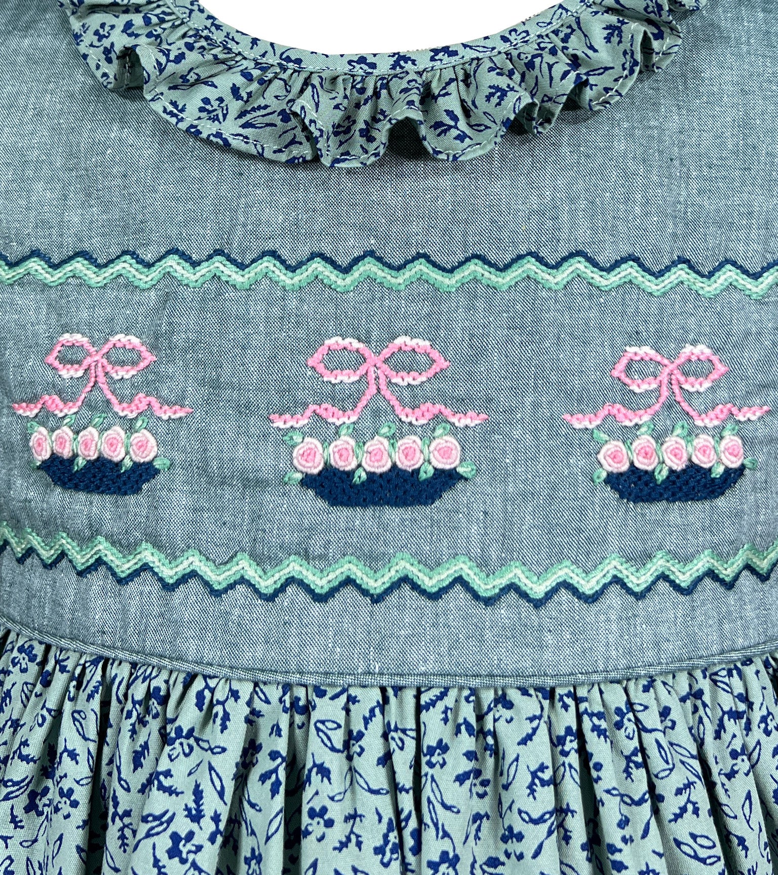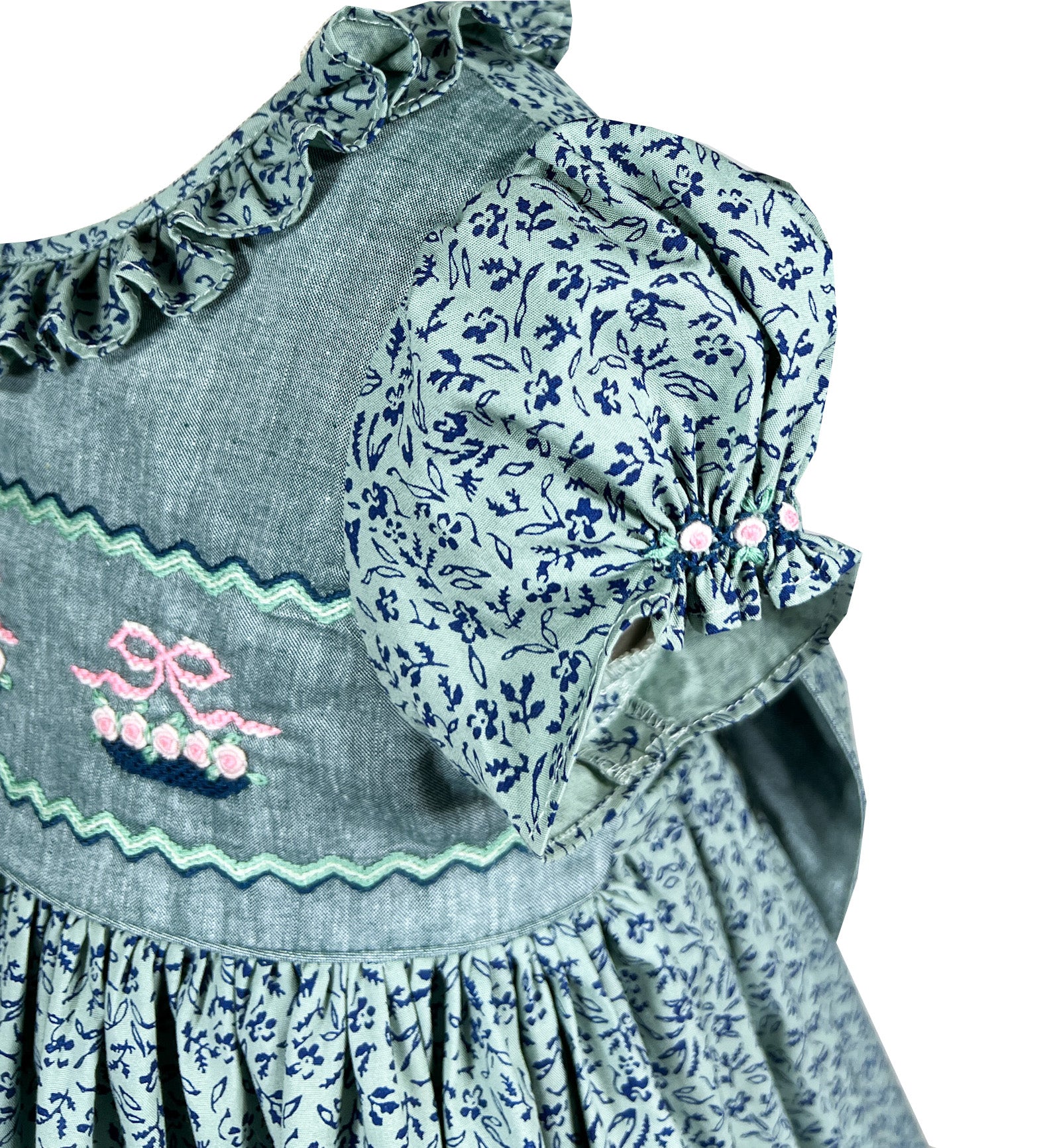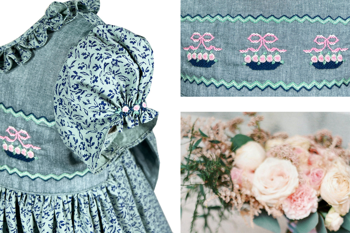Elle est confectionnée dans un imprimé floral romantique composé de petites fleurs bleu marine et de feuillages sur fond vert. Le devant de la poitrine est réalisé dans un tissu uni qui s'harmonise à merveille et met en valeur de superbes broderies faites à la main. Des paniers de fleurs roses et bleu marine, noués d'un délicat nœud et remplis de roses et de motifs en zigzag, ornent le corsage. Le souci du détail est remarquable, chaque fleur et chaque feuille étant soigneusement brodées pour créer des jardins portables sur la poitrine.