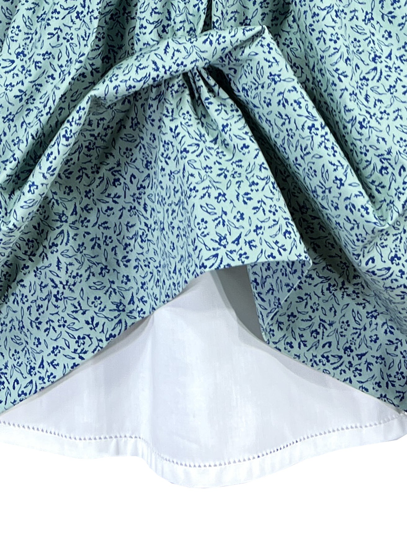 Le col plissé à volants ajoute un charme fantaisiste, tandis que les manches courtes ballons froncées assurent confort et liberté de mouvement. Des boutons recouverts dans le dos et notre nœud papillon signature complète le design avec élégance.